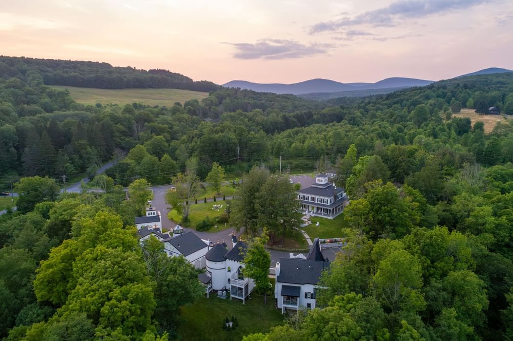 John Burroughs Woodchuck Lodge with a porch, surrounded by lush greenery and tall trees, near The Roxbury