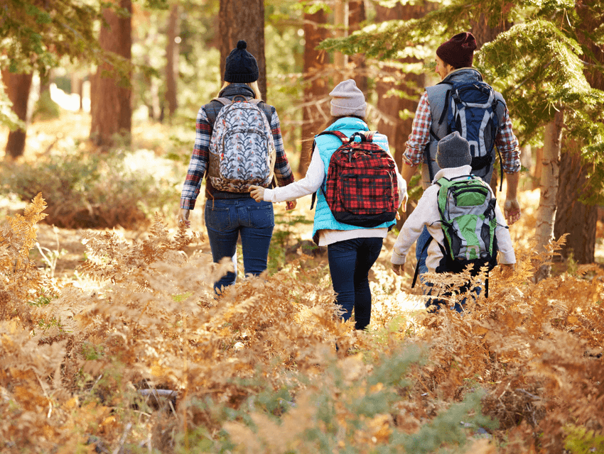 Group of four hikers traverses a forest path near The Roxbury, carrying backpacks, surrounded by lush greenery